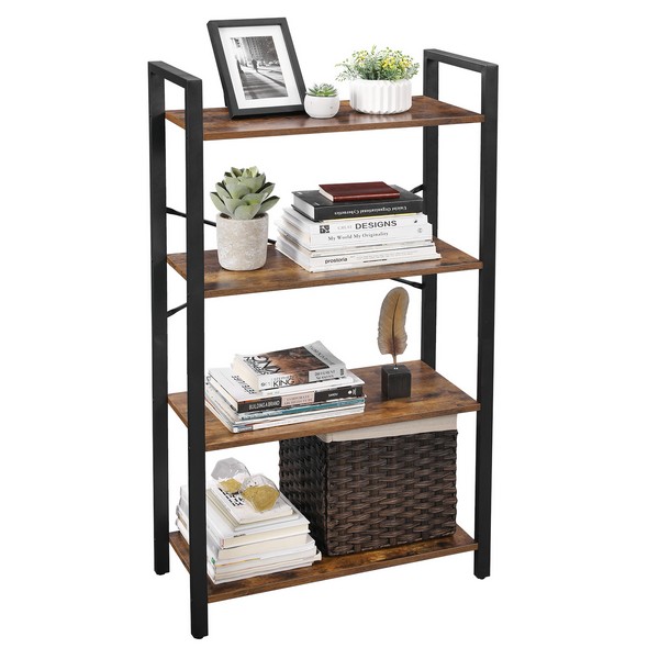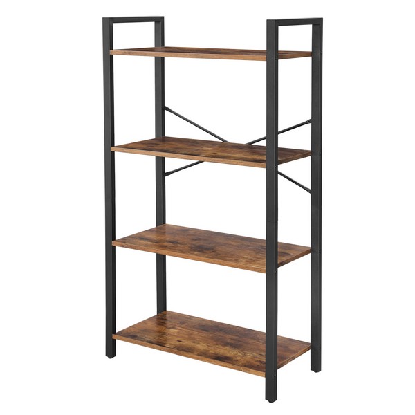 Denne gulvreol med sort metalramme og justerbare fødder, giver en simpel og stabil gulvreol i industrielt design stil, med 4 rustik brune hylder.