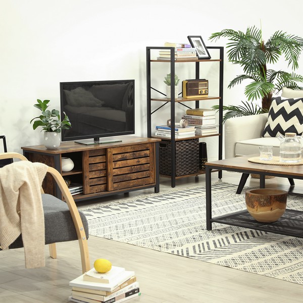 Reol i industrielt design stil - bogreol med 4 træhylder - rustik brun gulvreol - 120 x 66 x 30 cm: