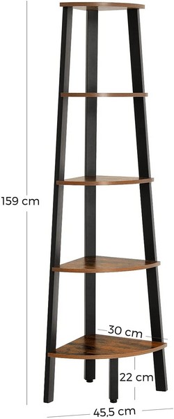 Denne gulvreol med sort metalramme og 4 fødder, heraf 2 justerbare, giver en simpel og stabil hjørnereol i industriel stil, med 5 rustik brune træhylder.