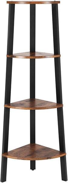 Denne gulvreol med sort metalramme og 3 fødder giver en simpel og stabil hjørnereol i industriel stil, med 4 rustik brune træhylder.