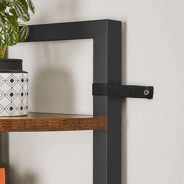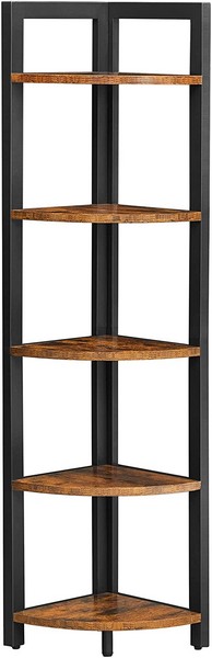 Denne gulvreol med sort metalramme og 4 fødder, heraf 2 justerbare, giver en simpel og stabil hjørnereol i industriel stil, med 5 rustik brune træhylder.
