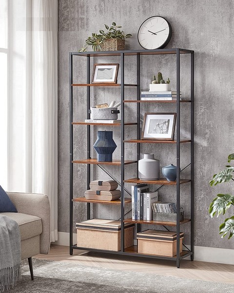 Gulvreol i industrielt design - reol med åbne hylder - rustik brun bogreol - stuereol: