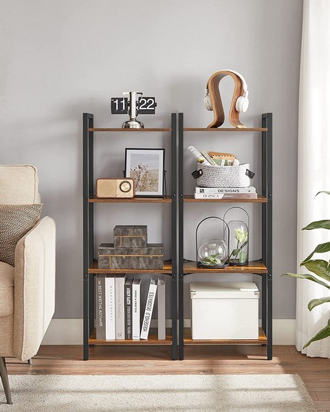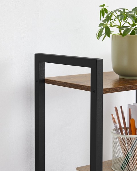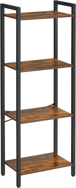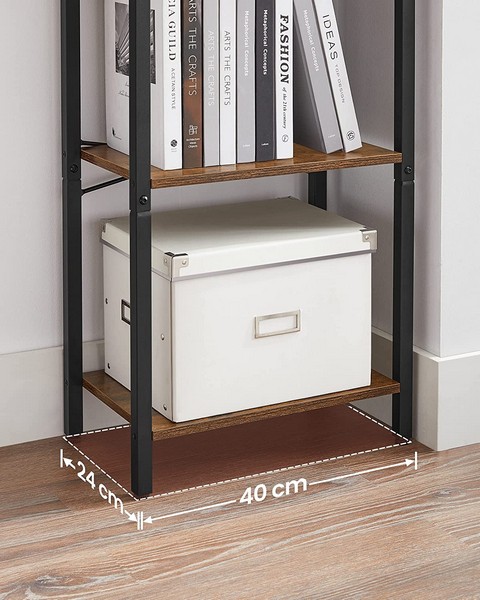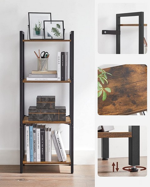 Denne smalle høje stuereol med sort metalramme og justerbare fødder, giver en simpel og stabil bogreol i industrielt design, med 5 rustik brune hylder.