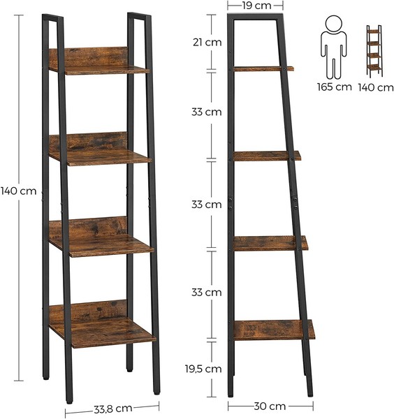 Stigereol i industrielt design - smal reol med 4 hylder med bagkant - rustik brun gulvreol - 140 x 30 x 34 cm