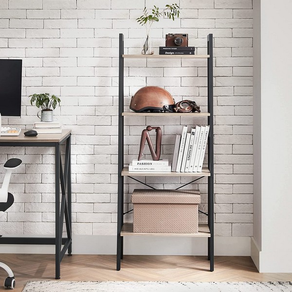 Stigereol i industrielt design - reol med 4 hylder og sort metalramme - grå beige (greige) gulvreol - 138 x 56 x 34 cm