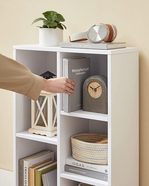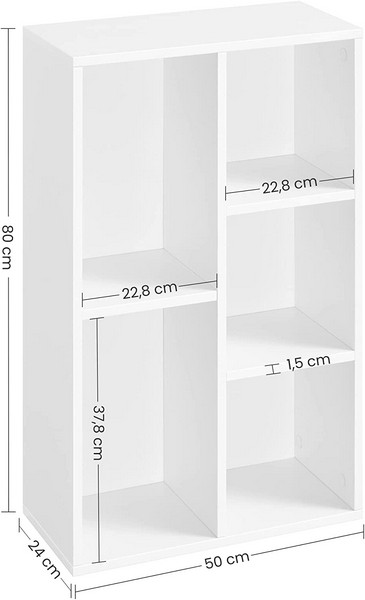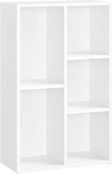 På bogreolens 3 hylder, som er opdelt i 5 rum, kan du opbevare større genstande såsom vinulplader, mapper eller dekorative vaser.