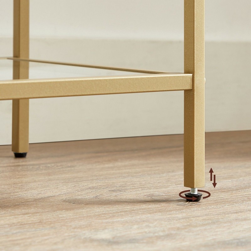 Det firkantet guldstel af pulverlakeret metal og glashylderne af hærdet glas, skaber et nutidigt udtryk, som passer både i stilfulde rum med stor polstret sofa og tæppe og i rum med minimalistisk indretning.