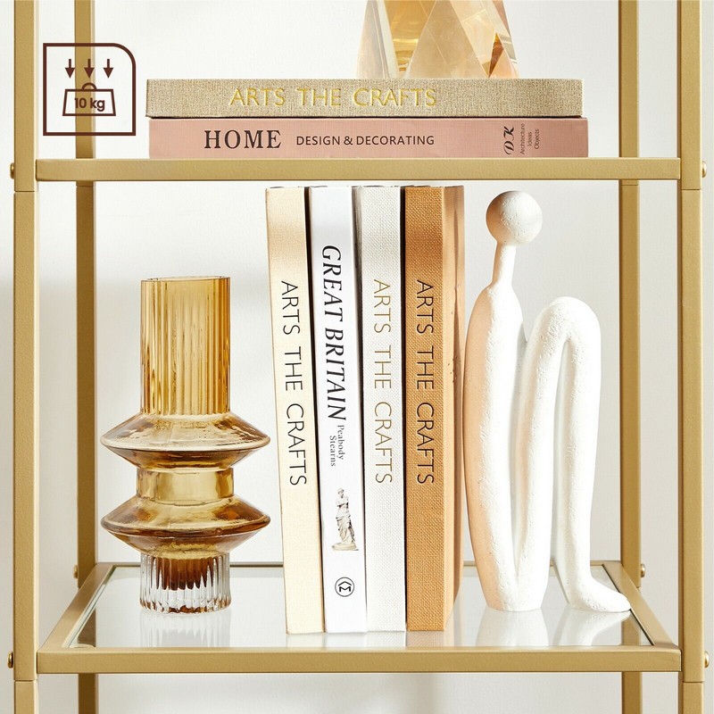 Denne gulvreol med gyldent stel og glashylder i hærdet glas giver dig ikke kun en stabil glas reol med opbevaringsplads, hvor du kan præsentere en vase med storslåede røde roser. Du får også en ny dekorativ glas reol med guldstel, som du kan placere som gulvreol i stuen, som glasreol i entreen, badeværelsesreol på badeværelset, køkkenreol i køkkenet eller som glas reol på et kontor til opbevaring af magasiner, vand og kager.