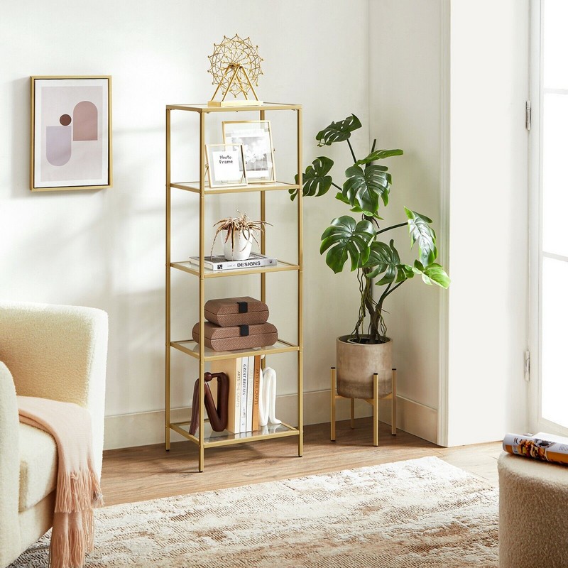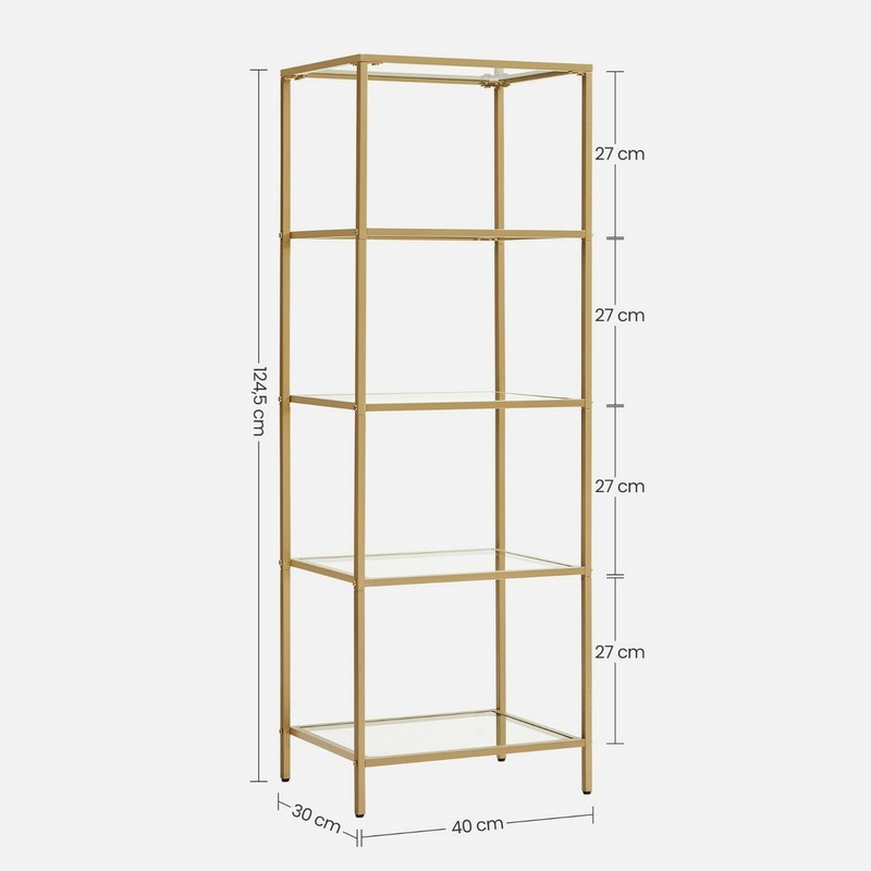 Badeværelsesreol - køkkenreol med 5 hylder og topplade i hærdet glas og gyldent stel - glas reol med guldben 40 x 30 x 124,50 cm
