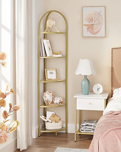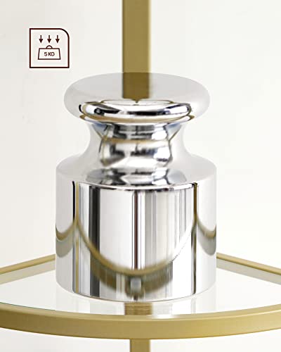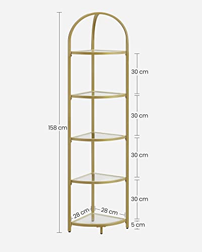 Hjørnereol med 5 hylder - fritstående gulvreol med glashylder i hærdet glas og gyldent stel - 28 x 28 x 158 cm