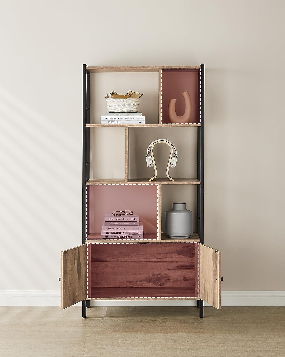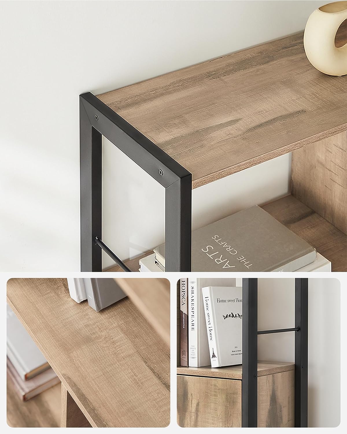 Bogreolen med skab, kan anvendes i stuen, børneværelset eller på kontoret og kan bruges til bøger, dekorationsartikler eller børnelegetøj. Den eg brune farve giver reolen et unikt udseende i industriel stil.
