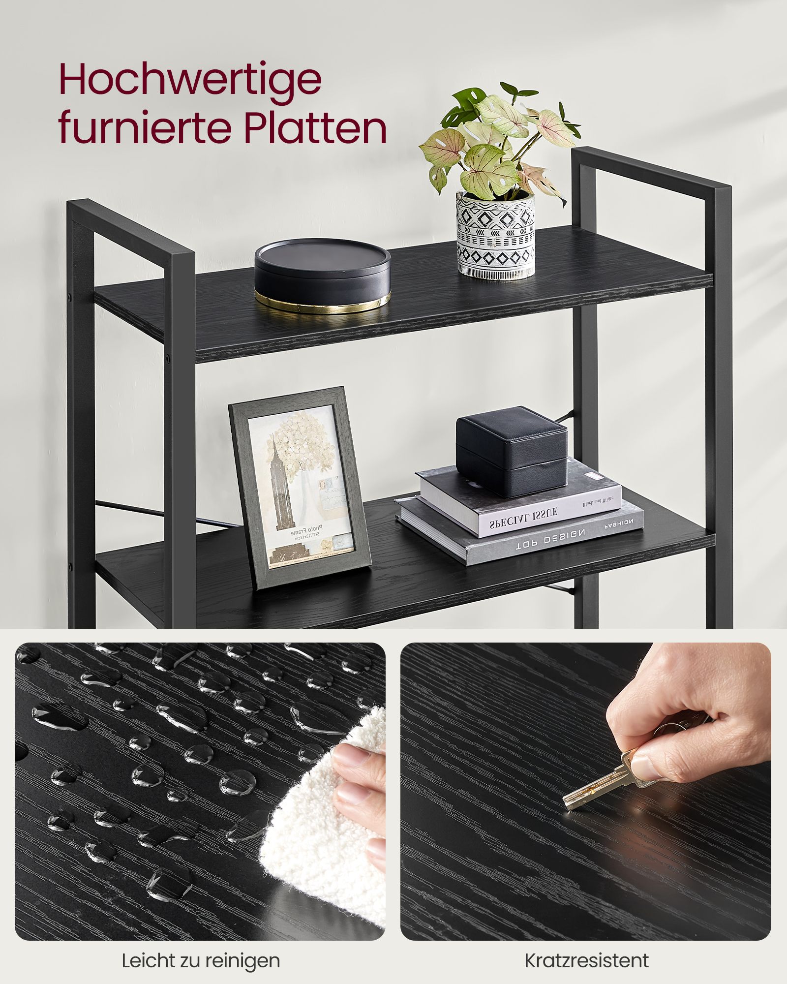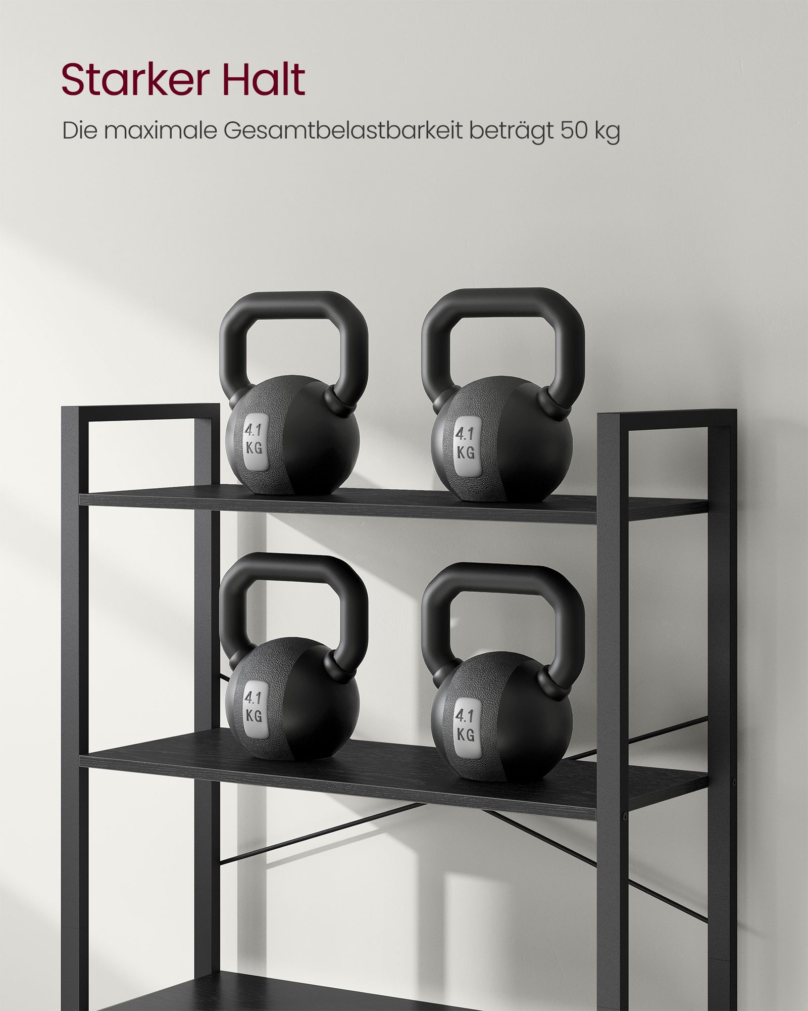 Med en robust stålramme og holdbare konstruerede hylder kan denne bogreol holde op til 10 kg pr. hylde, i alt op til 50 kg.