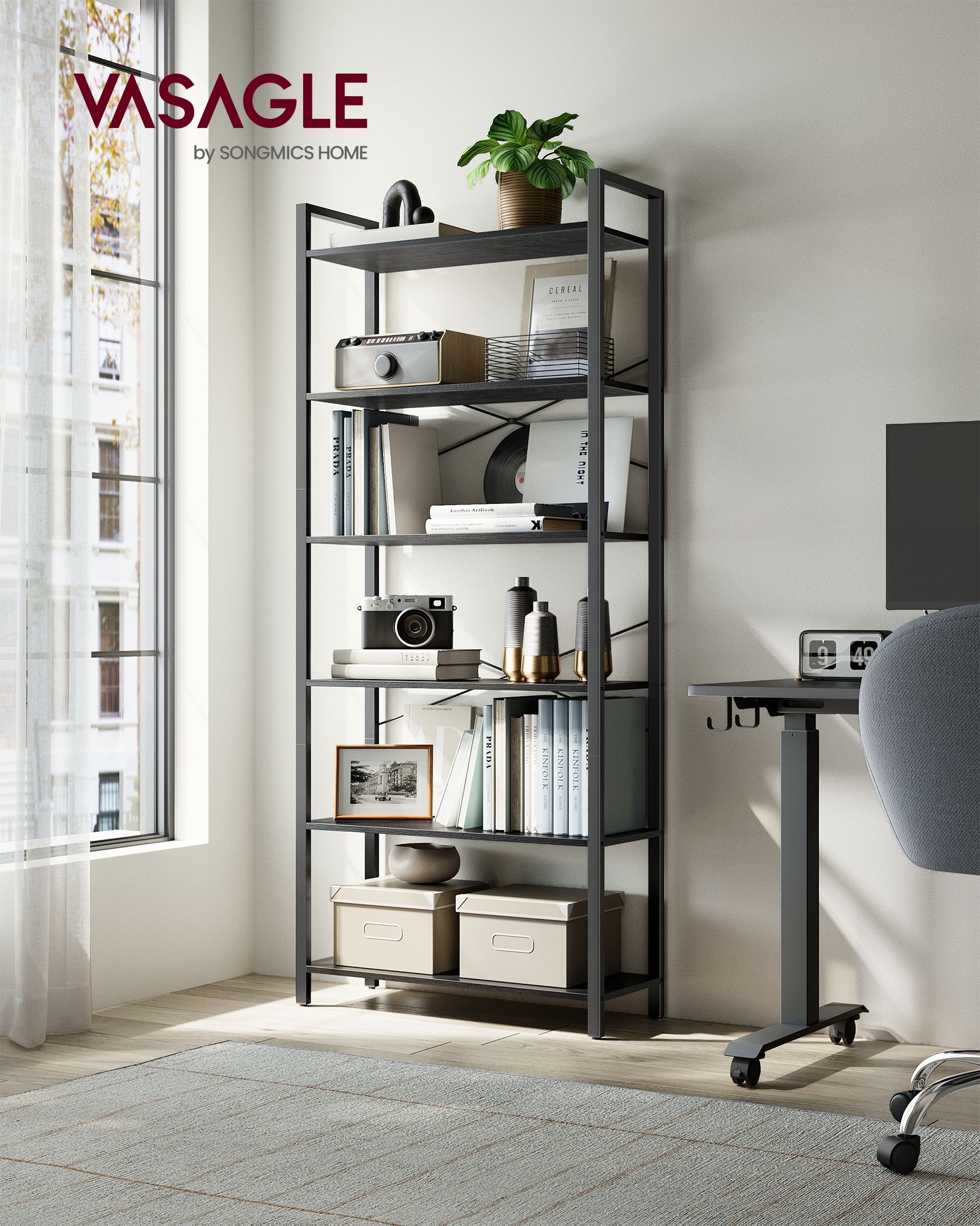 Bogreol i industrielt design - reol med 6 hylder - sort gulvreol - stuereol - 186 x 80 x 30 cm