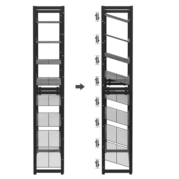 Design denne skoreol efter dine behov: Stable de to 4-lags skohylder oven på hinanden eller brug skoreolerne hver for sig. Monter de 8 sorte skohylder fladt eller på skrå. Det hele er din beslutning. Brug de to små skohylder i forskellige rum eller stabel dem oven på hinanden for at få 8 rummelig skohylder.