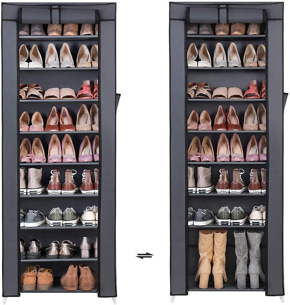 Skoreolen kan nemt rumme 27 par sko på de 10 hylder, idet hver hylde kan rumme 3 par sko (se billederne). Åbningen som dør, fastgøres med velcro og lynlåsen sikrer dit skotøj mod støv og snavs. Med dette grå skoskab får du orden på dine sko, som nemt sætte på de 10 hylder.