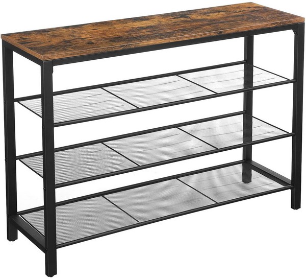 Skoreol i industrielt design med rustik brun tophylde og 3 hylder i metal til skotøj. Skostativ med 3 sorte skohylder, der er velegnet som et dekorativt entremøbel.