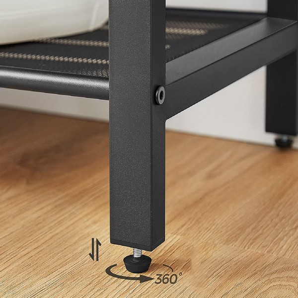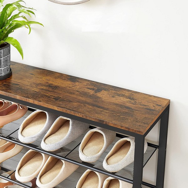 Reolen har 4 trådhylder, som giver masser af plads til dine sko. Den iøjnefaldende rustik brune tophylde kan rummer tasker, nøgler, rammer eller en smuk buket roser (toppen kan holde op til 10 kg og hver af skohylderne kan rumme op til 5 kg).