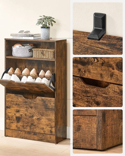 Skoskab i rustik brun træfarve med tophylder og 2 rum til 8-12 par sko. Skoreol med flot rustik brun farve, som giver et unikt udseende i industrielt design. Skoskabet i industrielt design er velegnet til skoopbevaring i entréen og kan indeholde mange par sko.