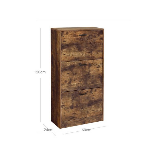 Skoskab i industrielt design med 3 skuffer - skoreol med 3 rum til sko - rustik brun - 60 x 24 x 120 cm