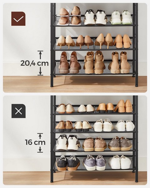 Hver trådhylde kan placeres fladt eller vinklet efter dine behov ved at fastgøre trådhylderne til forskellige skruehuller på begge sider. Takket være den hævede bagkant på trådhylderne, bliver væggen ikke snavset af skotøjet.