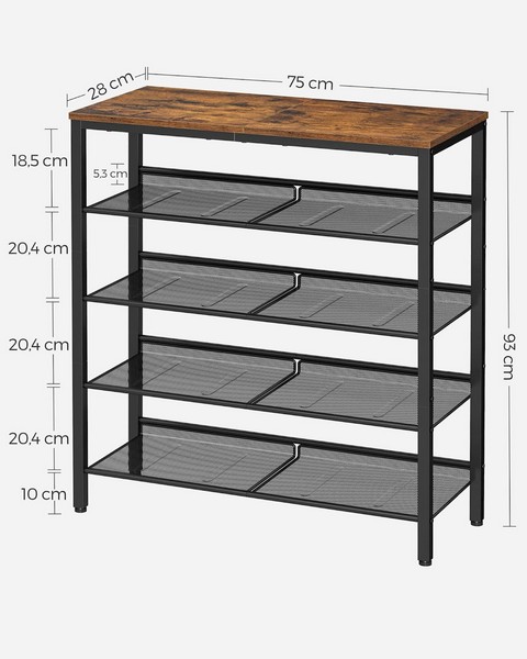 Skoreol i industrielt design med rustik brun 2-delt topplade og 4 justerbare skohylder til skotøj. Skostativ med 4 sorte metalhylder, der er velegnet som entremøbel med metalhylder til sko. Skoreolen har justerbare trådhylder, som kan monteres både fladt og på skrå.