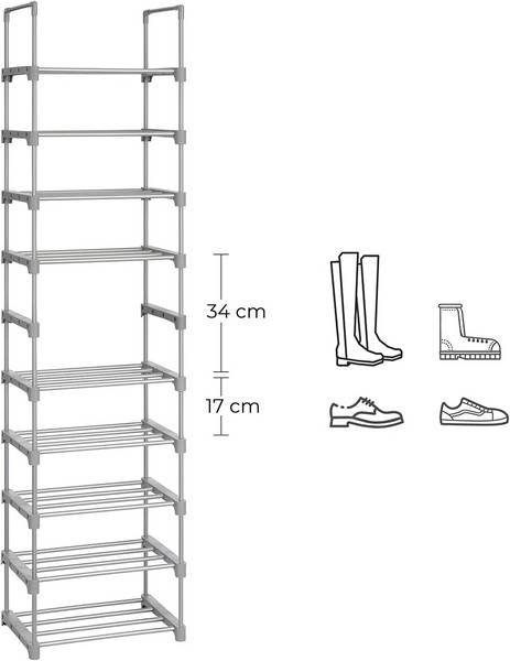 Skoreol med god opbevaringsplads. Delbart skostativ i grå metal med 10 skohylder, hvor der kan placeres mange sko.