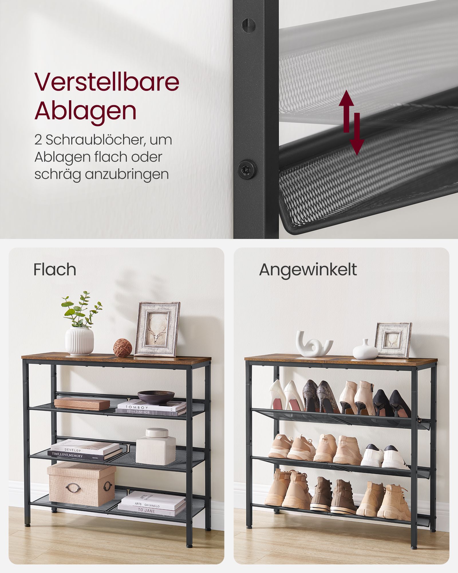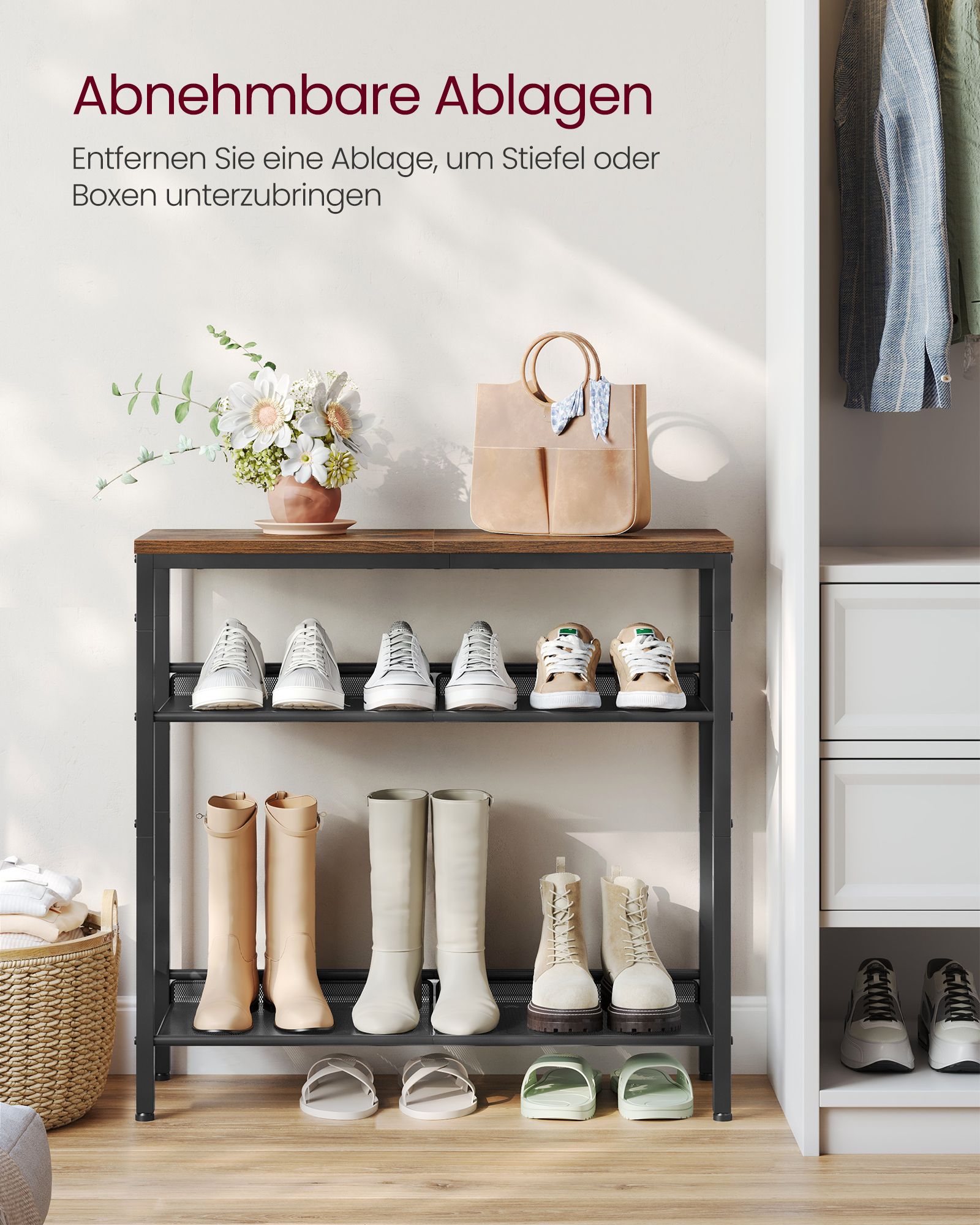Skoreol i industrielt design med rustik brun 2-delt topplade og 3 justerbare skohylder til skotøj. Skostativ med 3 sorte metalhylder, der er velegnet som entremøbel med metalhylder til sko. Skoreolen har justerbare trådhylder, som kan monteres både fladt og på skrå.