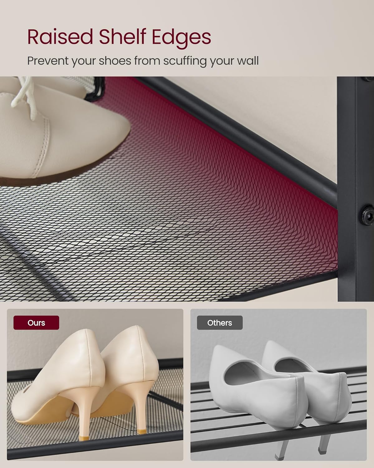 Hver trådhylde kan placeres fladt eller vinklet efter dine behov ved at fastgøre trådhylderne til forskellige skruehuller på begge sider. Takket være den hævede bagkant på trådhylderne, bliver væggen ikke snavset af skotøjet.