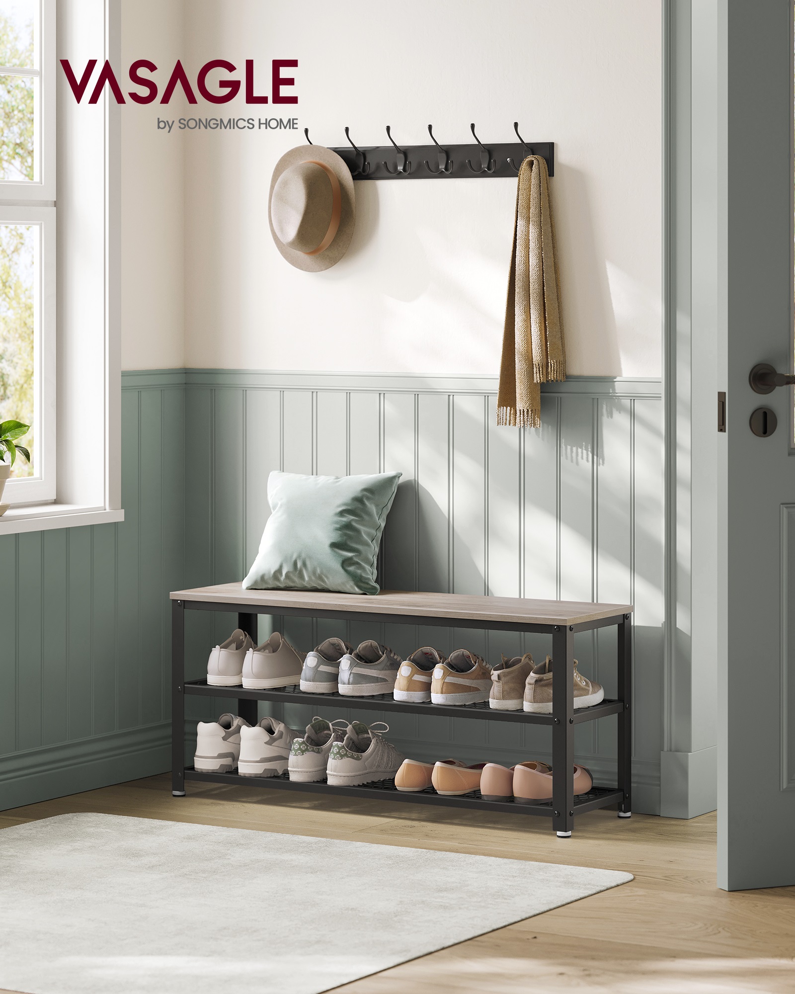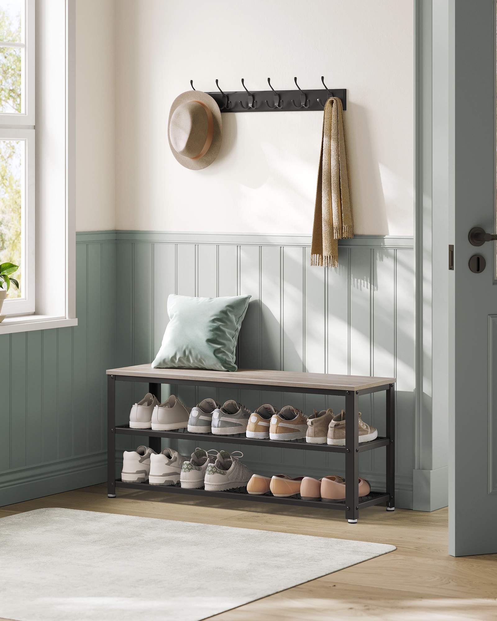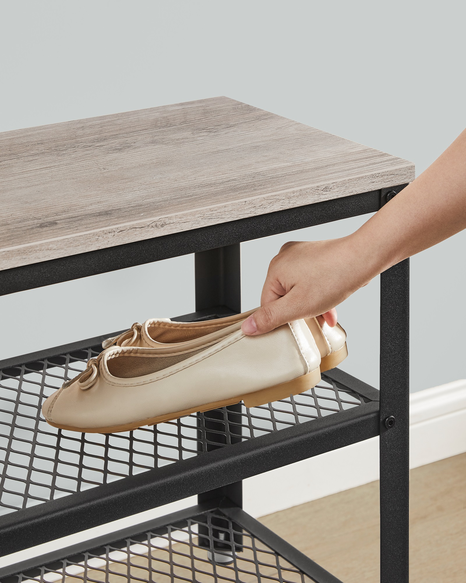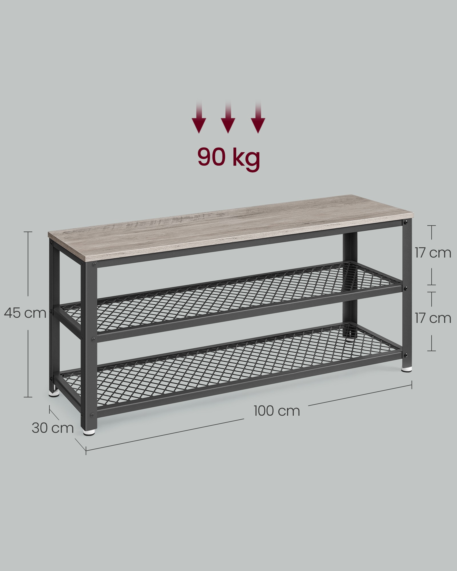 Skobænk i industrielt design - siddebænk med træsæde og hylder - entrebænk med skohylder - grå beige (greige) 100 x 30 x 45 cm