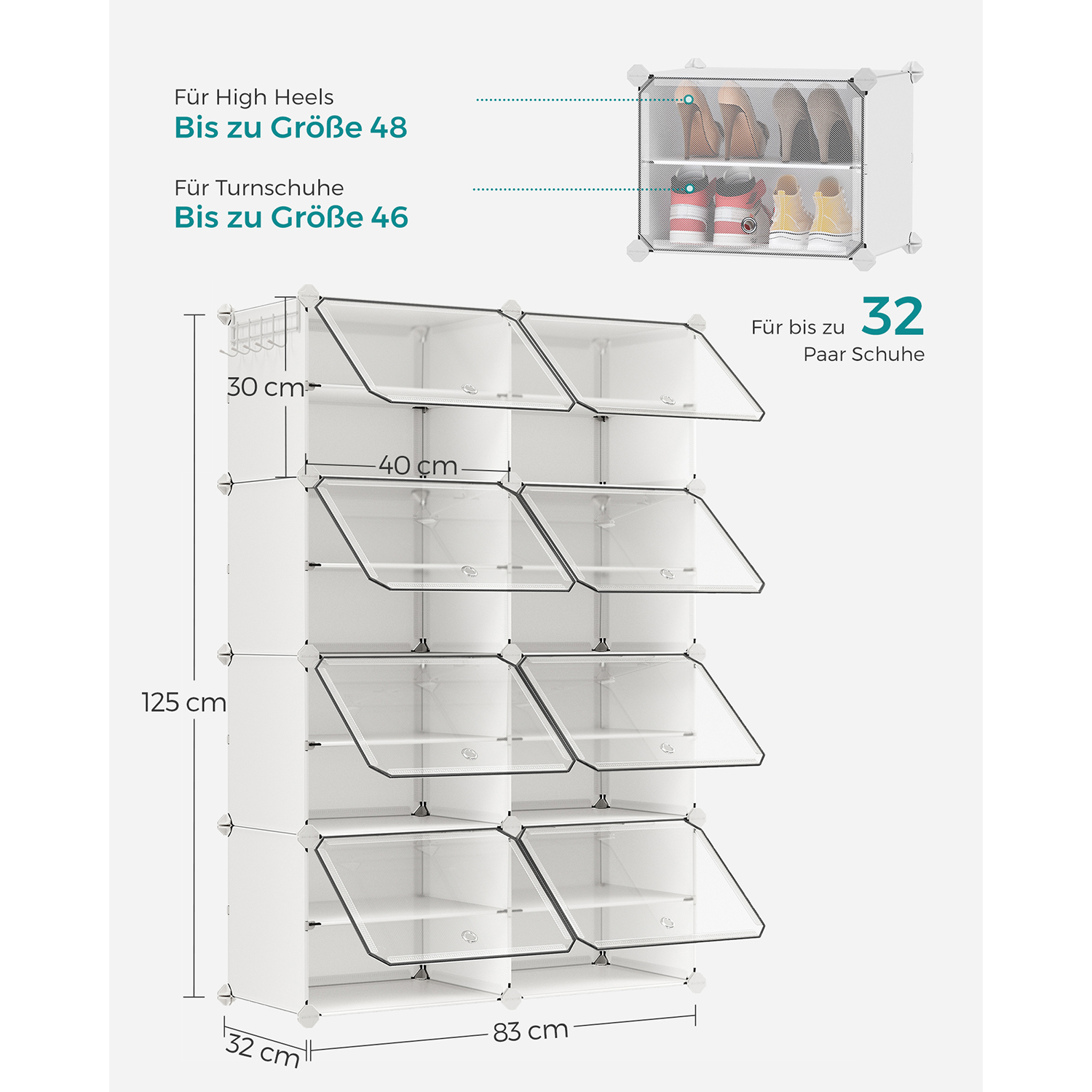 Fleksibelt stabelbart plastikskab: Sammensæt opbevaringsskabet på forskellige måder, f.eks. som skoreol med 8 rum der kan rumme op til 24 par sko eller køb flere skoskabe og stabel dem oven på hinanden. Saml opbevaringsskabet i 2 eller 3 forskellige højder eller rækker (se plastikskabets produktbilleder), eller opdel skoreolen i 2 mindre plastikskabe for at organisere tøj, sko eller toiletartikler, på dit badeværelse, din entre eller andre rum. Nyd fleksibiliteten i dette stabelbare opbevaringsskab.