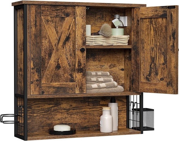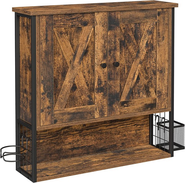 Specifikationer - rustik brun væghængt skab til badeværelset - badeværelsesskab i industrielt design med 2 skabslåger og justerbare hylder: