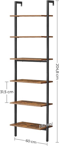 Gulvreol i industrielt design - bogreol med 6 hylder - rustik brun væghængt stigereol med justerbare fødder - reol 205 x 60 x 30