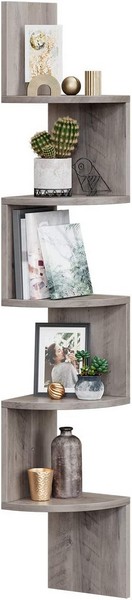 På hjørnehyldens 5 grå beige (greige) hylder i træ, kan du opbevare genstande såsom bøger, potteplanter eller dekorative vaser og den øverste hylde giver også plads til højere planter.
