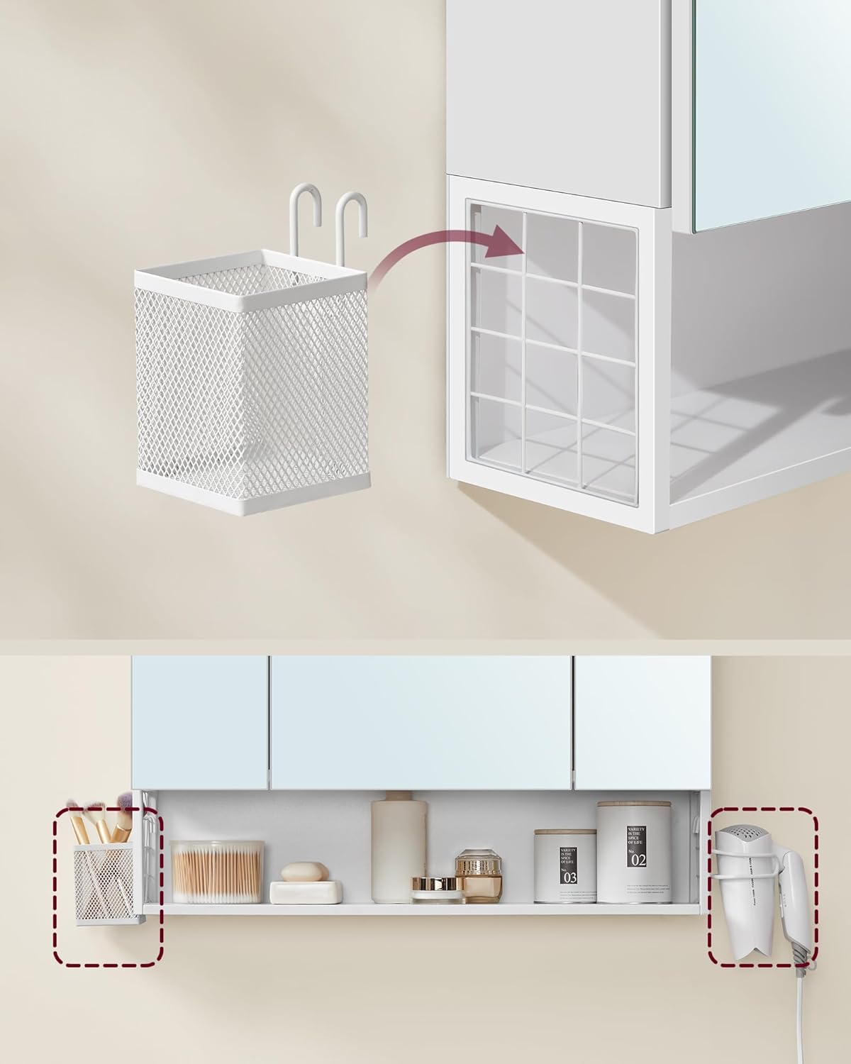 Hængekurv og hårtørrer holder: Den ene side af badeværelsesskabet er udstyret med en lille hængende kurv, der er praktisk til dine småting, og på den anden side er der en hårtørrer holder, der gør det nemmere at opbevare og bruge hårtørreren.