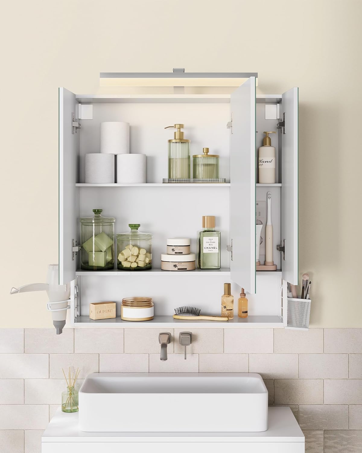 Dette væghængte spejlskab er udstyret med en lang LED-lampe. Det betyder mere lys både til at finde ting i overskabet og ligge den perfekte makeup.