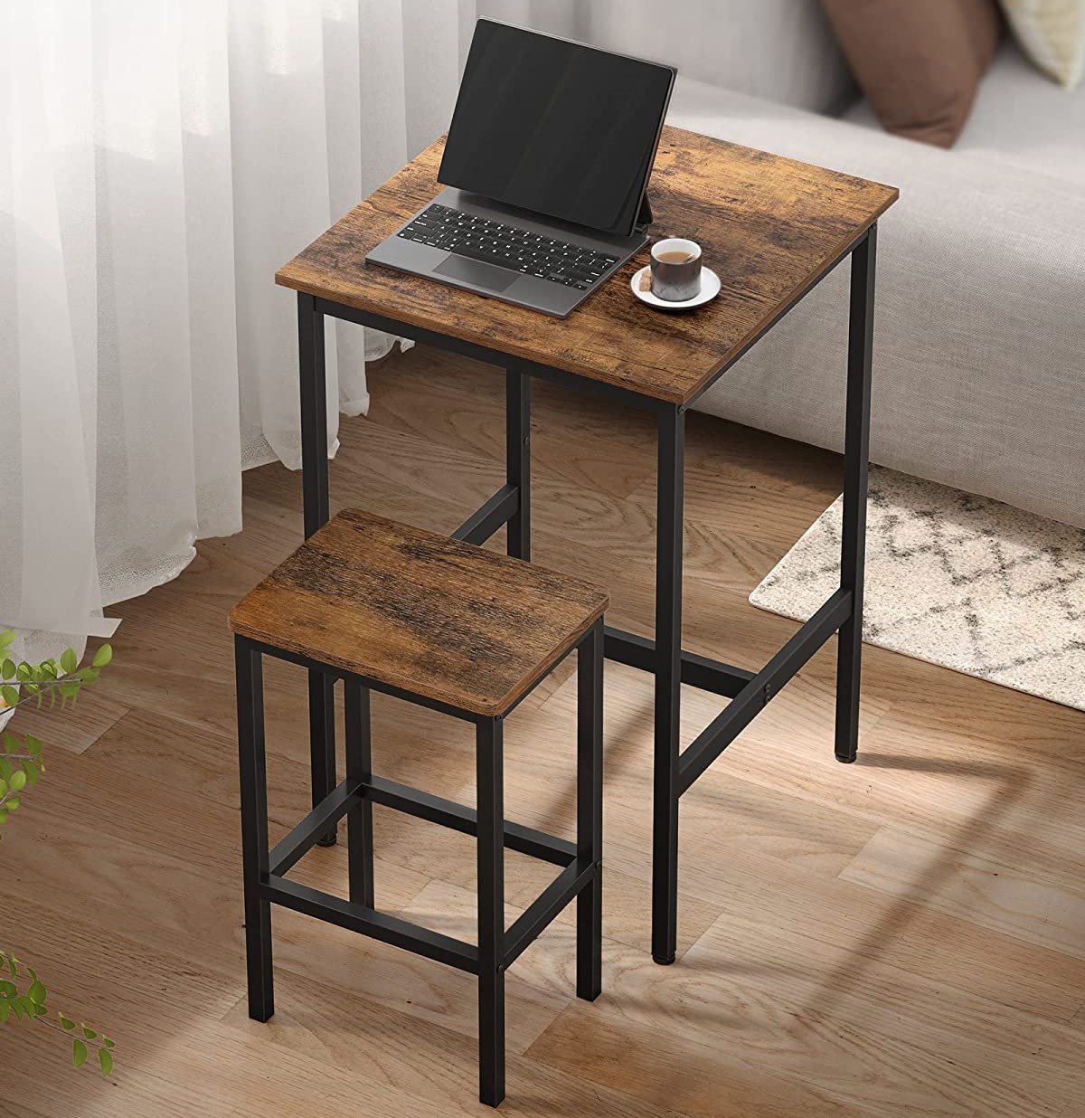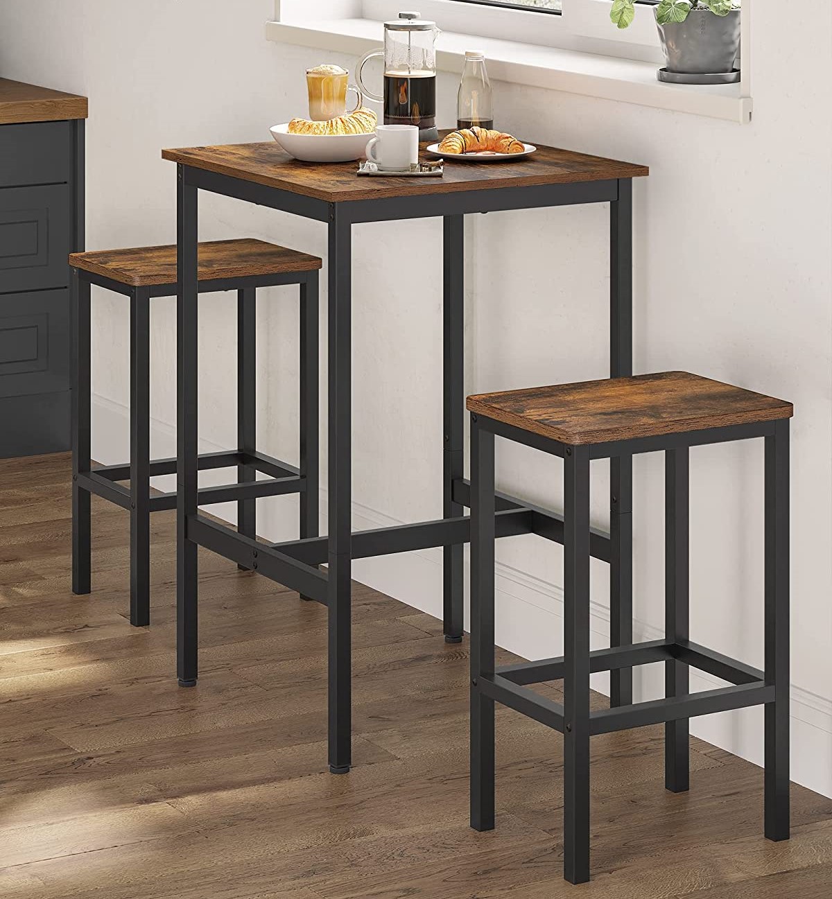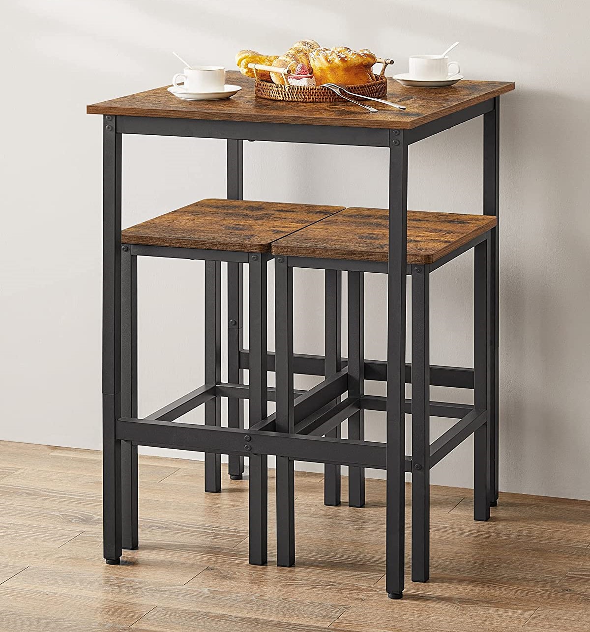Barbord med 2 barstole - højbord med 2 høje skamler - industrielt design til køkken og bar - rustik brun barbords sæt