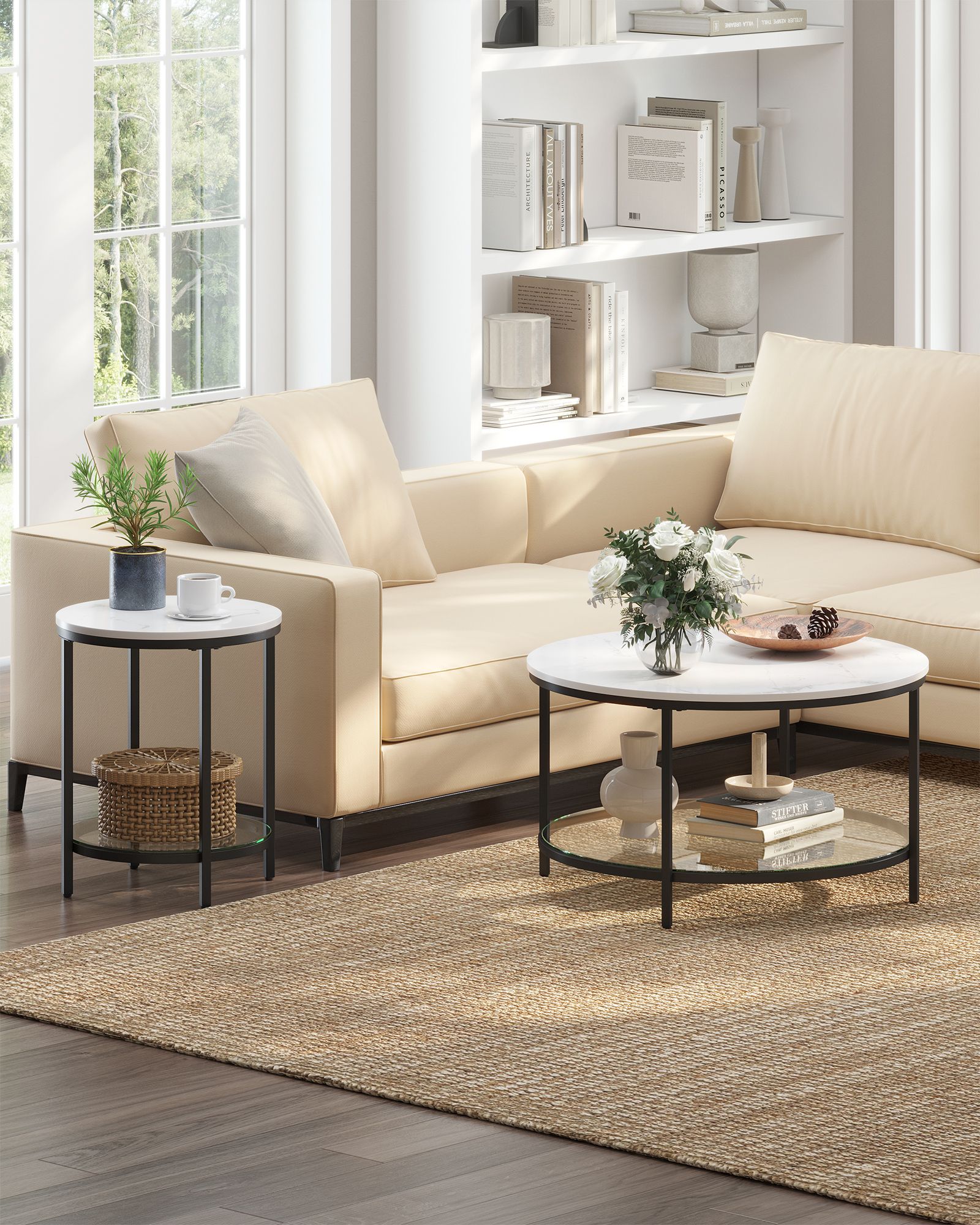 Det runde sidebord med hvide bordplade, skaber et nutidigt udtryk, som passer både i stilfulde rum med stor polstret sofa og tæppe og i rum med minimalistisk indretning.