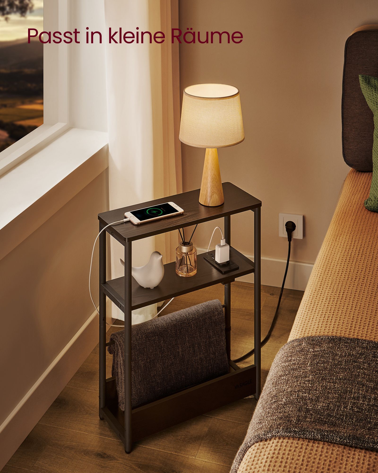 Sengebord med strøm - lille slank sidebord med strømstik - smalt natbord med 1 stikkontakter og 2 USB-porte - sort 18 x 45 x 58 cm