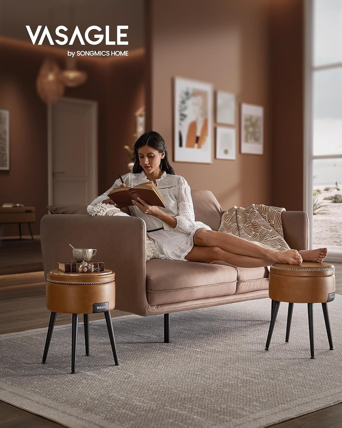 Dette brune runde sidebord med rum til opbevaring kan tjene som en smart rundt sengebord eller du kan blot vende toppen af sædet for at forvandle dette sidebord til en rund sidde skammel eller hyggelig fodskammel. Med en opbevaringskapacitet på 8,3 liter er dette sengebord perfekt til opbevaring af forskellige småting.