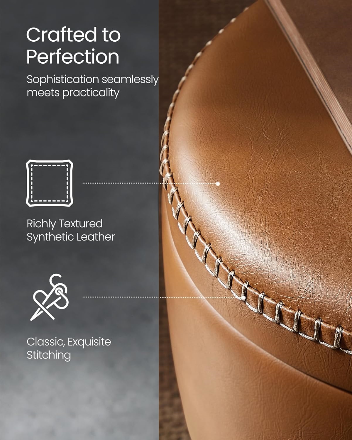 Med en blanding af brun syntetisk læder, raffinerede syninger og slanke tilspidsede ben, er denne runde sidebord, en håndgribelig hyldest til kunsthåndværkets ånd, der løfter dit hjem til nye sofistikerede højder.