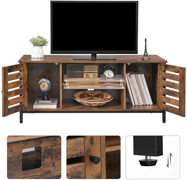 TV-bord i industrielt design med justerbare fødder, stor topplade, 2 åbne hylder og 2 skabe.