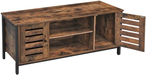 Med den varme rustikke brune farve omgivet af sort stål, er tv-bænken med skabe og hylder, en behagelig tilføjelse i de fleste rum, herunder stuen.