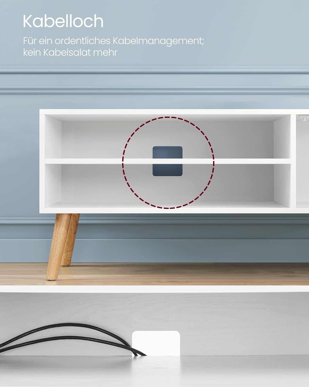 Hvidt TV-bord med hylder og skab i retro vintage 50'er look med bordplade, skrå ben, 2 åbne hylder og 1 lukket skab.