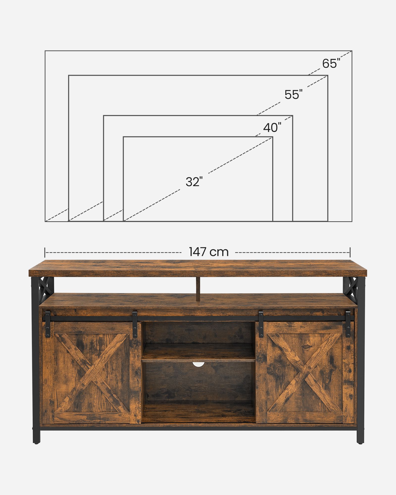 Industrielt design: Med sine 2 låger, X-formede rammer og rustikke brune farve giver dette TV-bord et industrielt design. Det vil være stjernen i din stue.