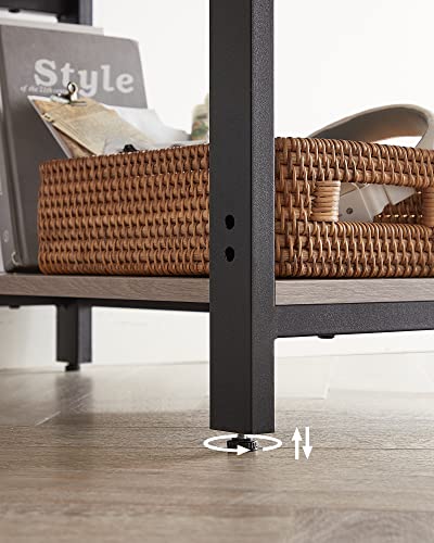 Dette computerbord i industrielt design med 2 hylder og justerbare fødder, gør det nemt at sikret dit rustik grå/beige computerbord mod ujævnt gulv, så computerbordet kan stå stabilt.