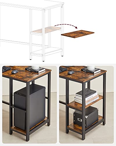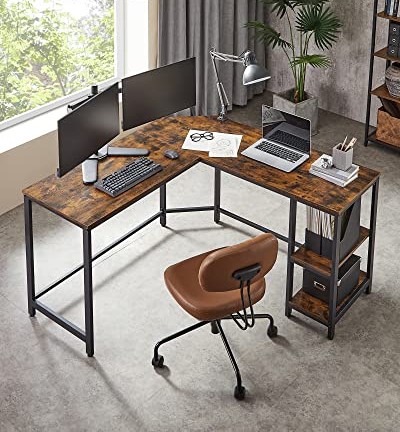 Dette stilfulde L-formet rustik brune computerbord passer til et hvert hjørne og med 2 praktiske hylder, der kan holde op til 10 kg pr. hylde, passer dette hjørneskrivebord perfekt ind i et stilet og kreativt hjemmekontor.