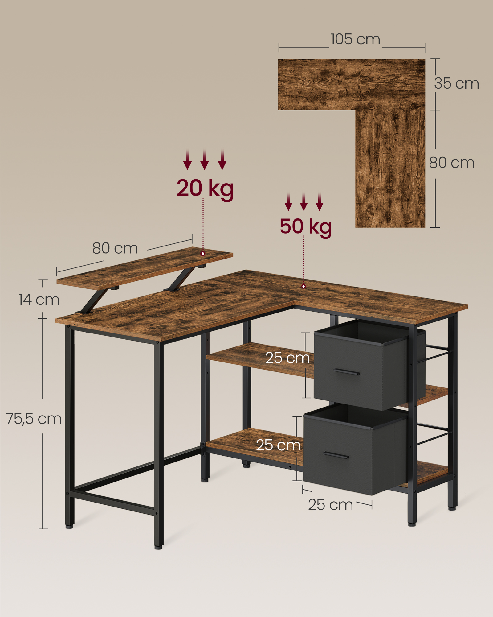 Specifikationer - Hjørneskrivebord med stof skuffer, hylder og skærmstativ - L-formet skrivebord - computerbord - rustik brun: