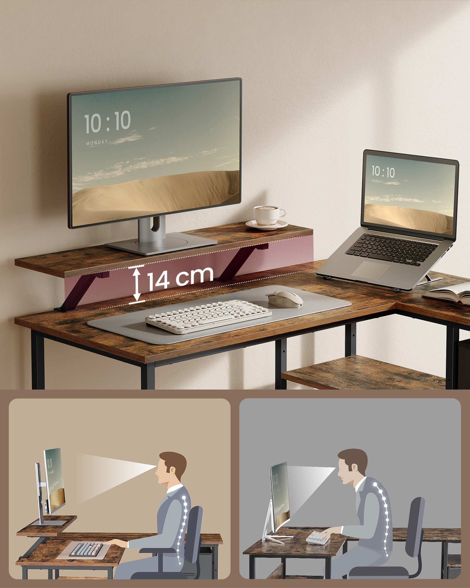 Fleksibel brug: Dette rustik brune L-formede skrivebord med skærmstativ på 80 cm, har et vendbart design, som giver dig mulighed for at installere stof skufferne til enten venstre eller højre af skrivebordet, hvilket gør det L-formet skrivebord perfekt til et stilet og kreativt gamerværelse eller hjemmekontor.