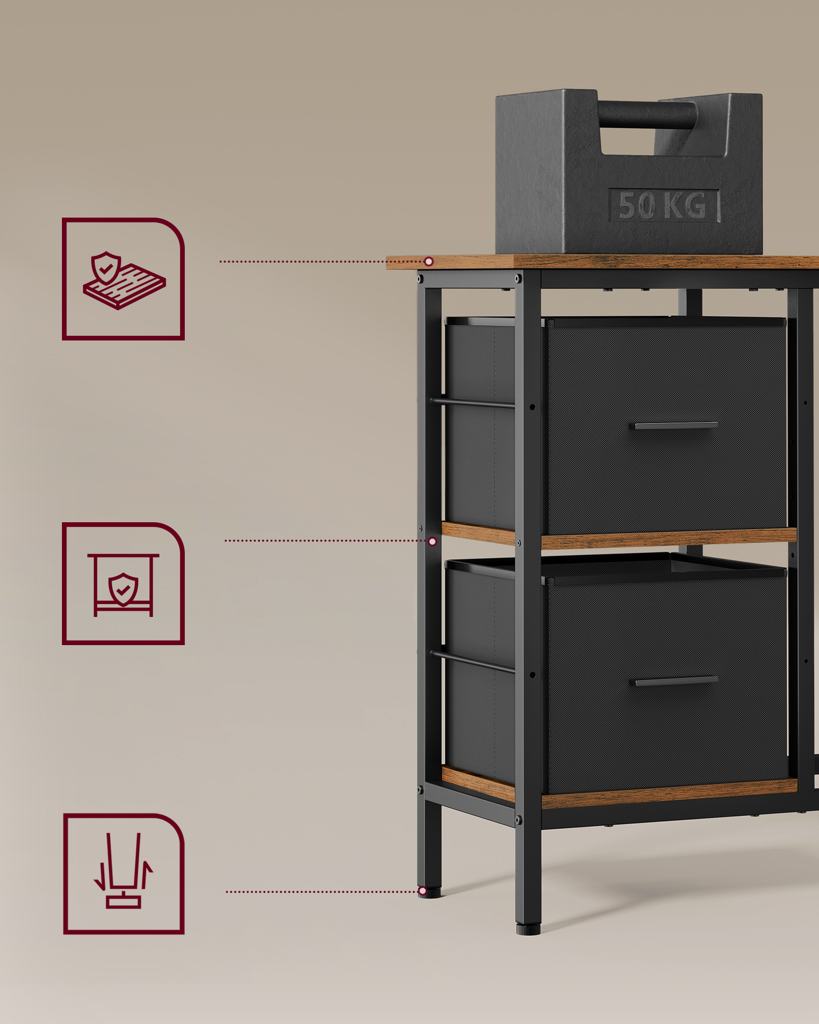 Rummelig og robust: 2 stof skuffer og hylder på computerbordet sikrer, at dit arbejdsområde er velorganiseret. Fremstillet med en stålramme og forstærkede tværstænger. Dette computerbord med hylder og stof skuffer understøtter derfor op til 50 kg på bordpladen og 20 kg på skærmstativet.