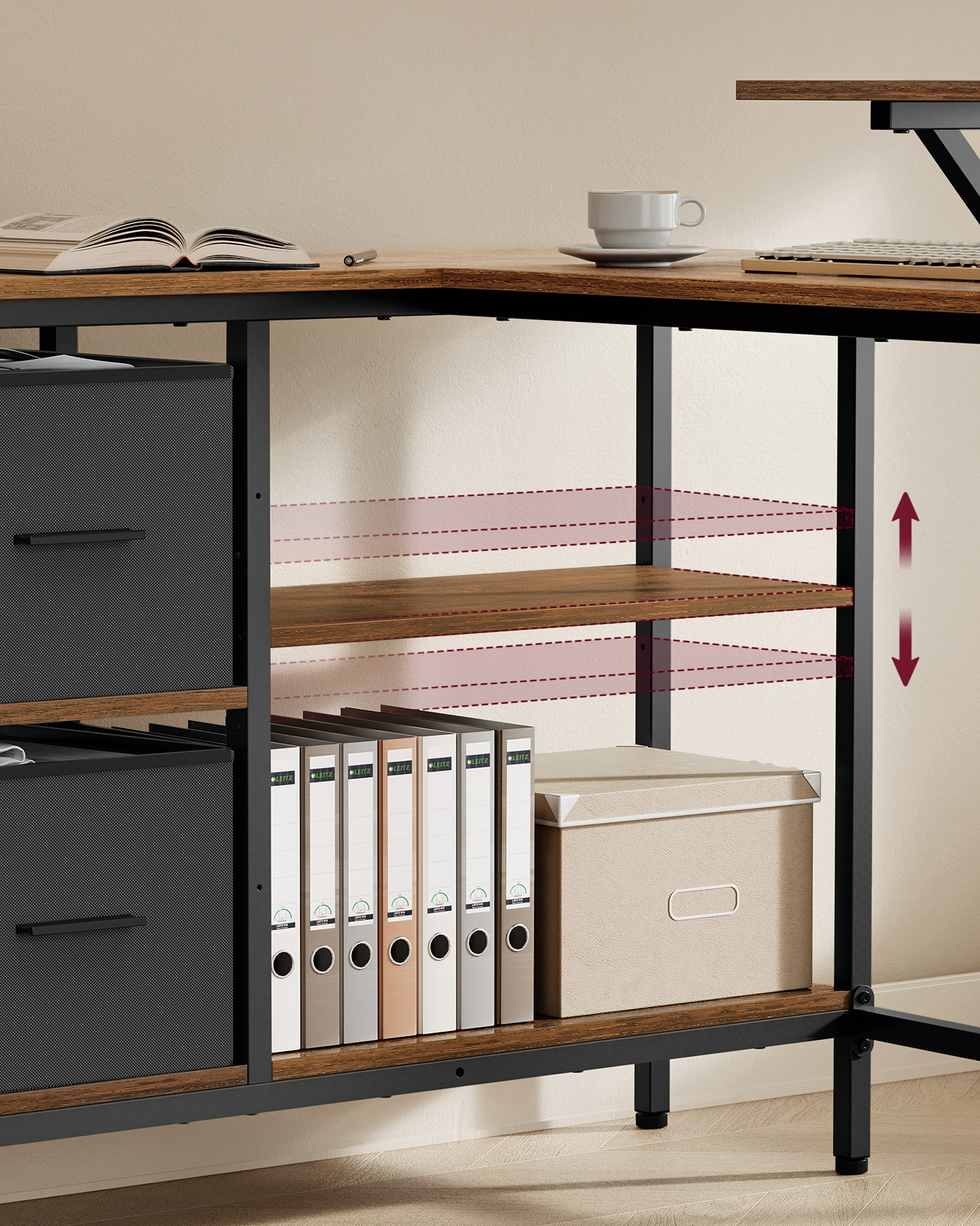 God opbevaringsplads: Med 2 rummelige stof opbevaringsskuffer giver dette hjørneskrivebord rigelig plads til mapper og kontorartikler. Den midterste hylde på hjørneskrivebordet kan justeres til 3 højdeniveauer, så hylderne passer til dine behov.